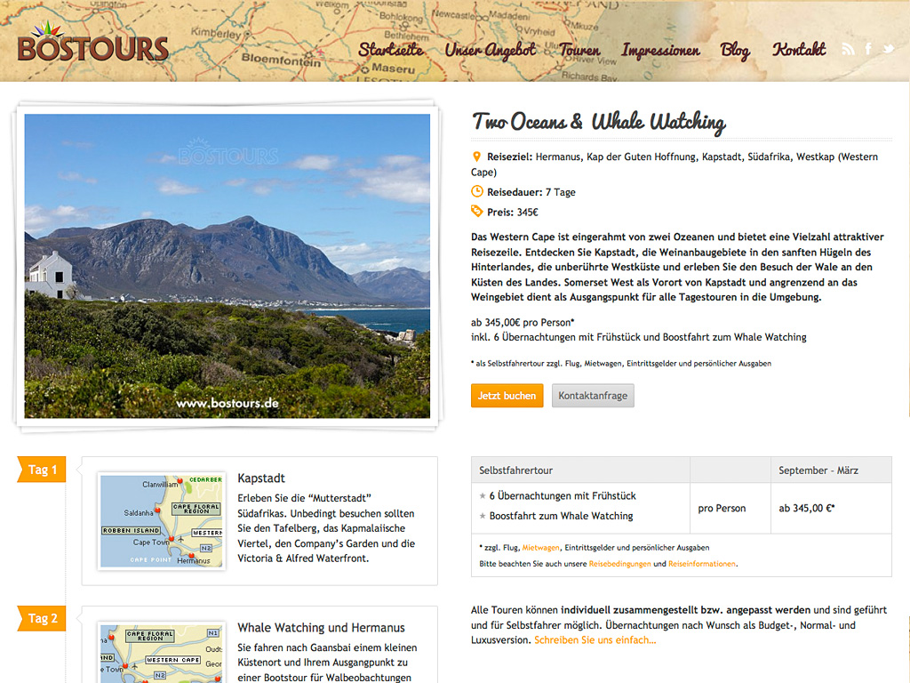 Die neue Webseite vom Südafrikaspezialist BOSTOURS ist seit heute online. Herrvonundzu hat das WordPressdesign ausgewählt, installiert, übersetzt und individuell auf die Bedürfnisse und das neue CI angepasst. Hinzu kommen die Bilder und deren Bildbearbeitung für das Web. Im Laufe der nächsten Tage folgt die Facebookseite …